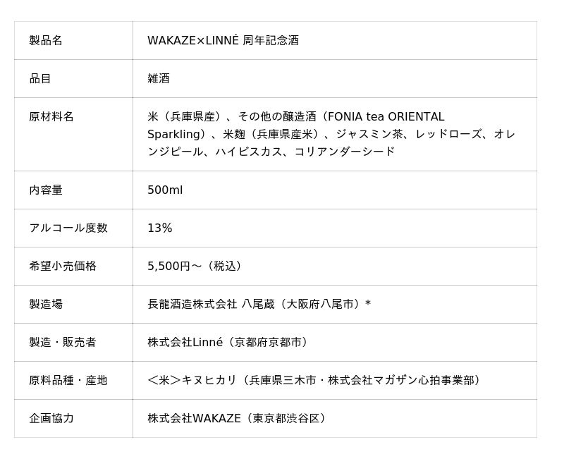 酒造りを起点に食文化を醸すファーメンテーション・コレクティブ(発酵集団)、株式会社Linne(リンネ)【本社:京都府京都市、代表取締役:今井翔也、以下LINNE】は、株式会社WAKAZE【本社:東京都渋谷区、代表取締役CEO:稲川琢磨、以下WAKAZE】と共に、WAKAZEの創業10周年とLINNEの創業2周年を記念した限定醸造酒《WAKAZE×LINNE 周年記念酒》を、2026年4月16日より一般販売いたします。