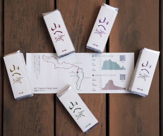 「山へ」をプリントした包装紙の内側には、高尾山域を楽しむランナーへ向けた高尾山トレイルマップをプリント。