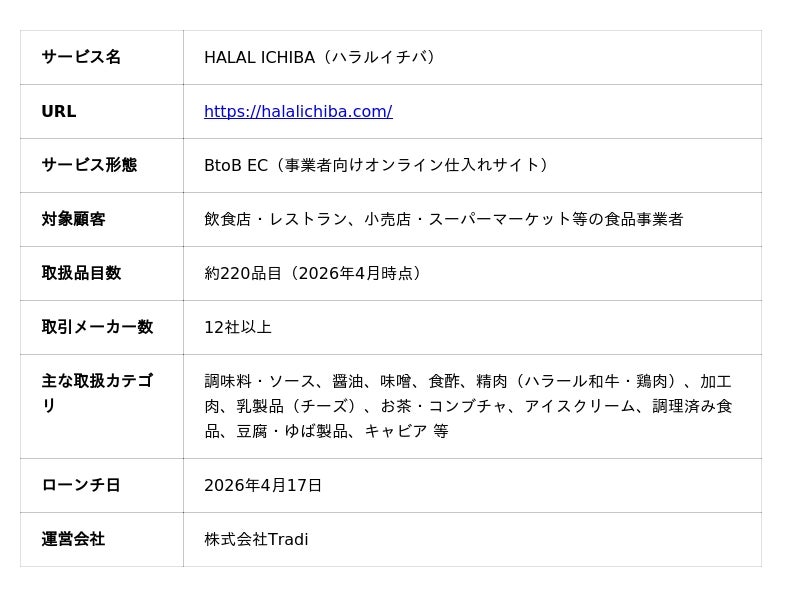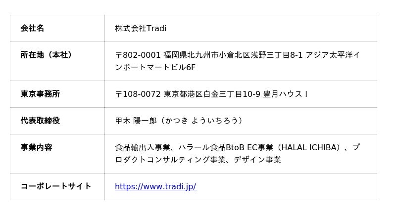 株式会社Tradi(本社:福岡県北九州市、代表取締役:甲木 陽一郎、以下「当社」)は、ハラール認証食品およびムスリムフレンドリー食品に特化したBtoB ECサイト「HALAL ICHIBA(ハラルイチバ)」( https://halalichiba.com/ )を、2025年04月17日に正式ローンチいたしました。