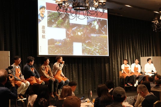 食事開始前には、恒例となったトークセッションを実施。今回は「東三河の農業の課題について」をテーマに、生産者6名と今里総料理長が登壇しました。 気候変動への対応や、未来の農業の担い手不足や一方で労働不足にロボットを搭載するなど、各々が農業を続けていくための取り組みや想いが語られました。