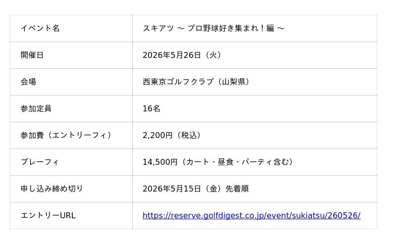 株式会社ゴルフダイジェスト・オンライン(本社:東京都品川区、代表取締役社長:石坂 信也、以下「GDO」)は、共通の"好き"でつながる交流型ラウンド企画の第一弾として、プロ野球を愛するゴルファーが集う特別イベントを2026年5月26日(火)に開催します。
