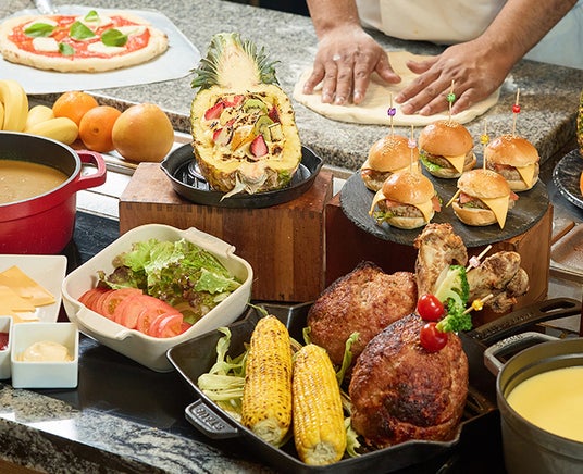 それぞれの期間に、特別料金やスペシャルメニューをご用意しており、ライブキッチンでシェフが作る料理の数々、石窯ピザ、焼き立てパンなど、バラエティに富んだ料理とスイーツがお召し上がりいただけます。