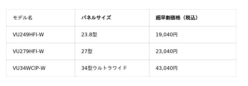 さまざまなデスク環境や用途に合わせてお選びいただけるよう、23.8型、27型、34型ウルトラワイドの3モデルを展開しています。