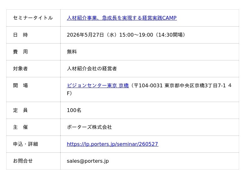 人材ビジネス向けマッチングシステムを提供するポーターズ株式会社(東京都港区、代表 西森 康二)は、2026年5月27日(水)に「人材紹介事業、急成長を実現する経営実践CAMP」を開催いたします。