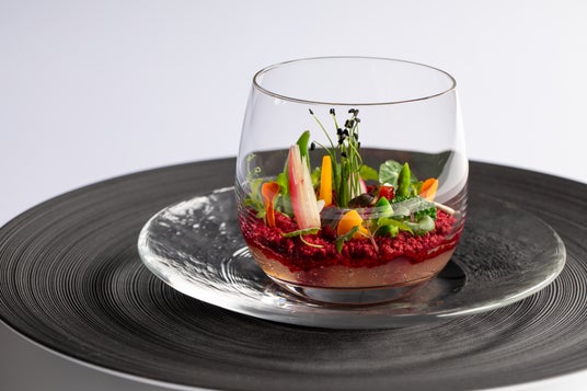 茶葉や山菜をはじめとした春野菜、糠漬け野菜を用いてコンソメにしたガスパチョ を五味・五法・五色を用いて多様な表情を引き出します。