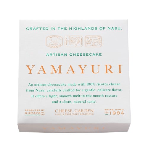 『YAMAYURI』は、リコッタチーズのミルク感、コク、甘みが感じられる、軽やかな口どけのレアチーズケーキです。那須で酪農業を始めて、良質な草をつくり、それを食べて元気に育ったジャージー乳とホルスタイン乳から、それぞれの特徴を生かしたチーズを作り続けているチーズ工房「so-boku」のリコッタチーズを100%使い、チーズガーデンが紡いできた、那須の美しい自然とともに"この地でしか作れない"菓子作りの技術・製法で作られた、"ここでしか生み出せない"一品です。那須の土地で育まれ、手間暇かけて作る素材の個性を大切にして、職人が一つひとつ丁寧に手仕事で作り上げることから、那須本店にて毎月数量限定で発売いたします。