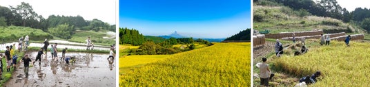 【左右:HONEY CRAFTとVena Energy共催による八重の棚田での田植え・稲刈りの様子、中央:八重の棚田と桜島】