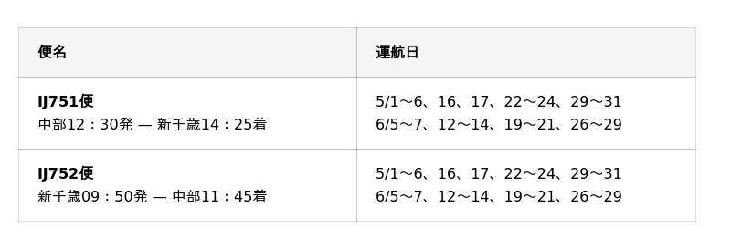 【中部-新千歳】(新規就航)