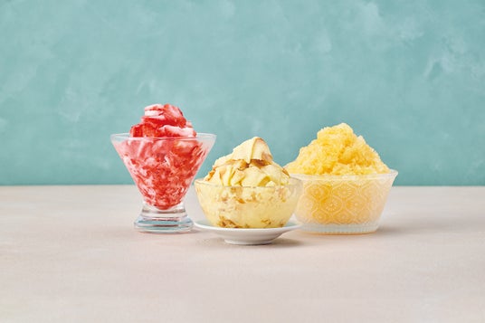 冷凍フルーツをそのまま削ることで、ヘルシーなデザートとしても◎左から、冷凍いちごかき氷、プリン凍り、オレンジジュース氷。オリジナルスイーツも簡単に作れます。