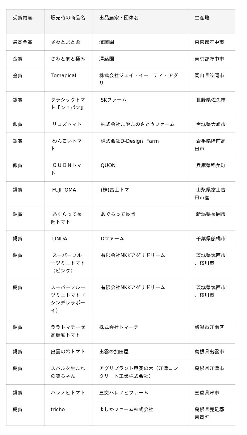 一般社団法人 日本野菜ソムリエ協会(東京都渋谷区、代表理事:福井栄治、以下当協会)は、2026年4月22日(水)に、農産物のさらなる価値向上を目指す青果物の品評会イベントとして「第5回全国ミニトマト選手権」(以下、本選手権)を東京・大阪で開催しました。全国から集まったおいしさ自慢のミニトマト全95品の中から、評価員である野菜ソムリエが産地や品種、生産者などの情報をすべて伏せて食味。そのおいしさを審査し、もっともおいしい「ミニトマト」を決定しました。