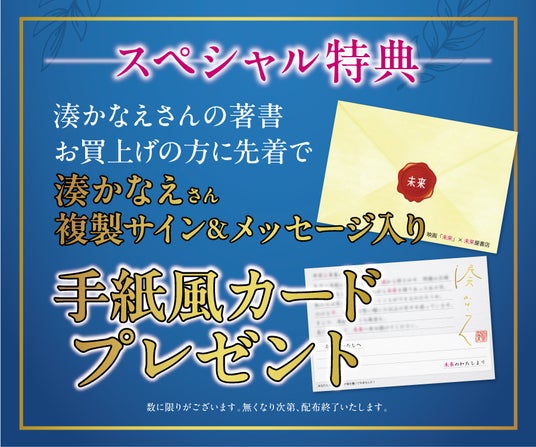 本特典は、映画『未来』にちなみ、湊かなえ氏ご本人が"過去の自分へ宛てて書いた手紙"を掲載した特別仕様。複製サイン入りの本フェア限定デザインとなっております。