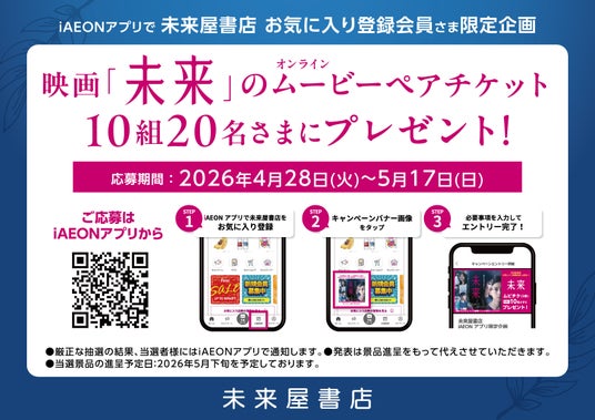 また、iAEONアプリ内で2026年4月28日(火)から5月17日(日)までの期間、抽選で10名様に映画『未来』のペアチケットが当たる応募キャンペーンを実施します。