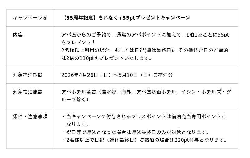 アパグループは1971年5月10日に石川県小松市にて創業し、本年5月10日(日)に創業55周年を迎えます。ご愛顧いただいているお客様への感謝の気持ちを込めて、アパ直(アパホテル公式サイト・アパアプリ)では、4月26日(日)~5月10日(日)のGW期間限定でお使いいただける「割引クーポン」やお得な特典付き「スペシャルプラン」をご用意しております。この機会に是非アパ直をご利用くださいませ。クーポン利用条件やプラン詳細は下記キャンペーン概要ならびに特設サイトをご確認ください。