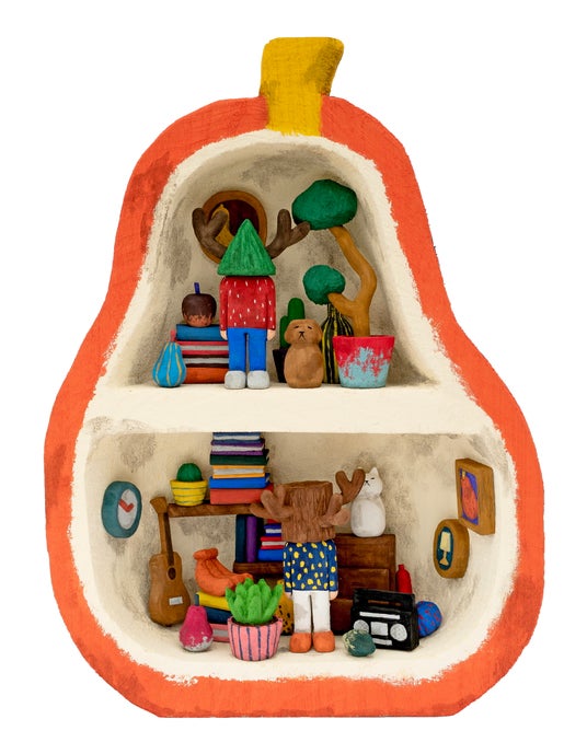 その作品にしばしば現れる、人のような身体に植物の頭部を持つモチーフは、作家が幼少時に岡山の豊かな自然の中で育った経験が原型として存在しています。また、高校卒業後に渡ったロンドンで、街路樹や公園など人の手で整備された植物を「自然」と呼ぶことに抱いた違和感をきっかけに、作品を通じて現代社会における自然と人間の境界線を追求していくこととなります。