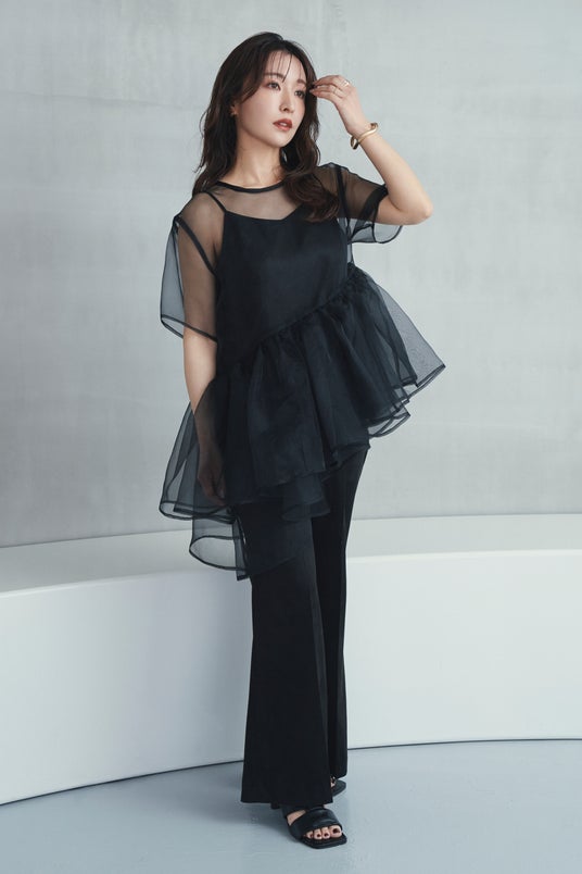ブラウスは斜めに切り替えたペプラムデザインがモードな印象で、