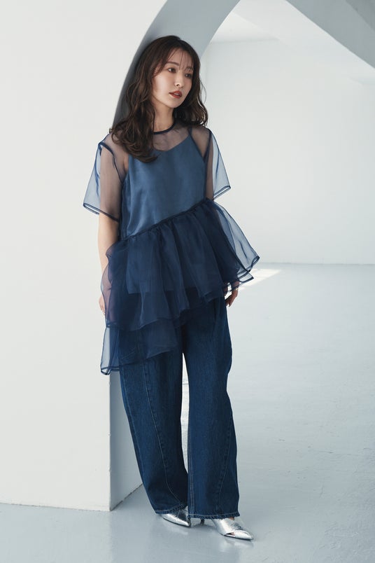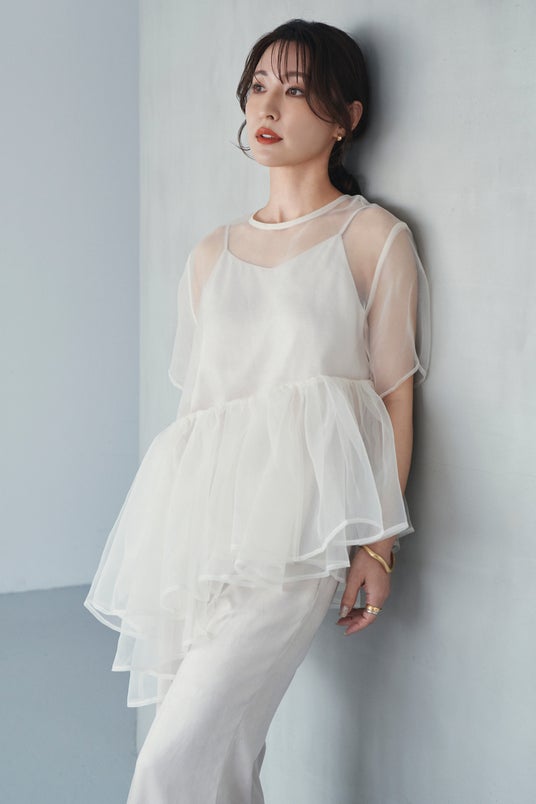 シアーのペプラムブラウスとキャミソールのセットアイテム。
