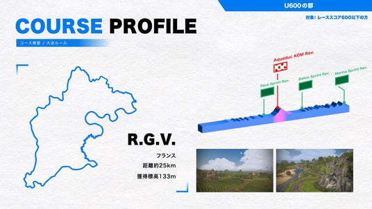 舞台となるコースはフランスの「R.G.V.」。走行距離24.9km、獲得標高133mという比較的フラットなレイアウトです。しかし、コース中盤に待ち受ける「Aqueduc KOM」(距離400m、平均勾配0.9%、逆回り)が、集団を破壊するであろう勝負所となります。