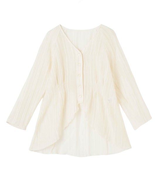 扱いやすさに配慮したボタンを厳選し、腕の動かしやすさと着脱のしやすさを兼ね備えたラグラン袖を採用。気になるお腹や二の腕をさりげなくカバーしつつ、背面のギャザーとフィッシュテールの裾で後ろ姿もすっきりとした印象に。脚長見えも期待されます。