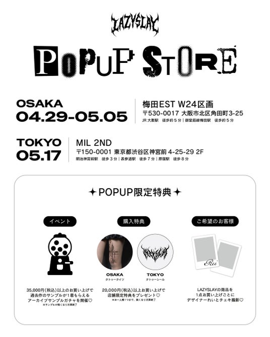 ブランドをスタートしてから、ずっと目標にしていた念願の大阪POPUPがついに実現します。関西の皆さんに直接LAZYSLAYのアイテムを手に取っていただける機会を楽しみにしています。
