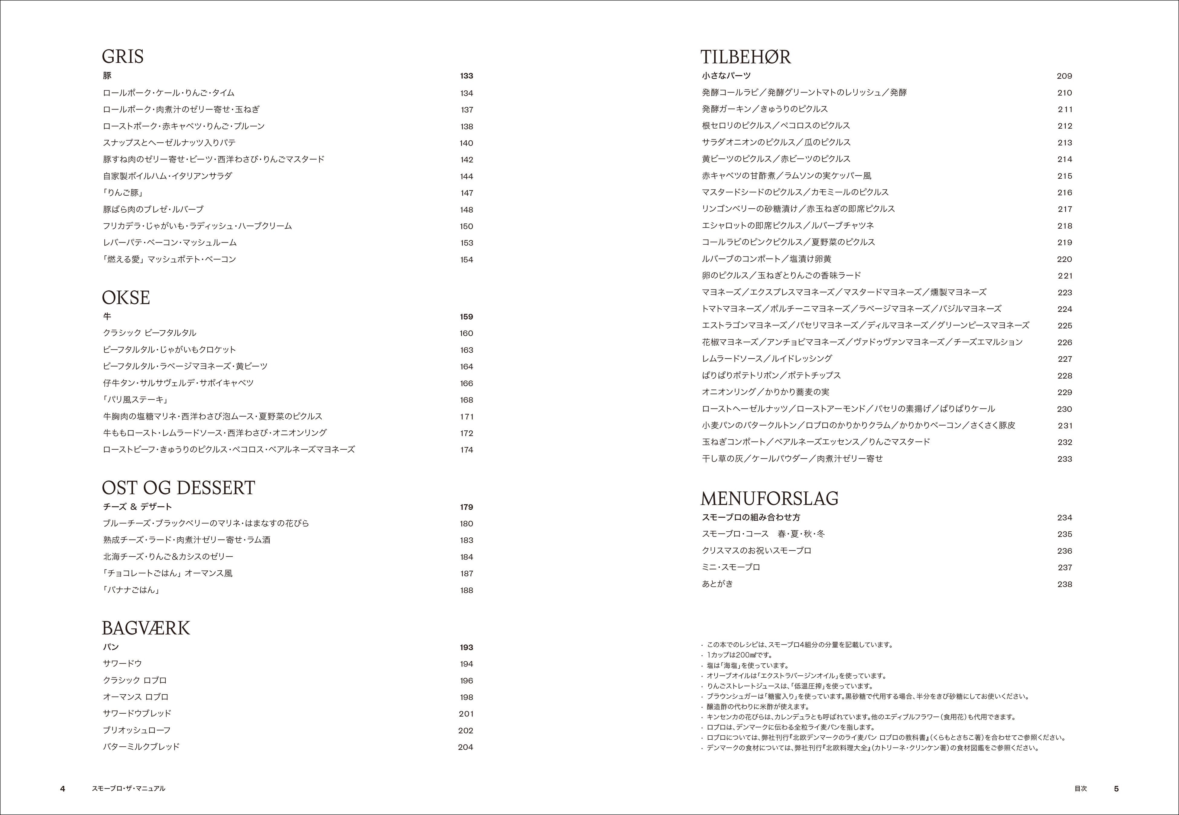 魚、野菜、鶏・鴨・雉、豚、牛、チーズ&デザートといった素材別に構成されたスモーブロのレシピに加え、それらを支えるパンや小さなパーツのレシピも詳しく紹介しています。