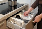 キッチンキャビネットの引き出し内上部のデッドスペースになりがちな空間を生かします。収納するものに合わせて、取付け位置を自在に変えられる内引き出しです。