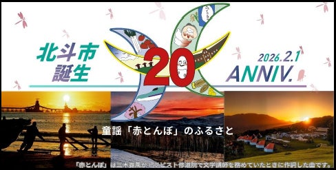 北斗市誕生20周年を祝うロゴマークと、今年度の新幹線発車メロディに採用予定の童謡「赤とんぼ」を題材としています。このデザインには、北斗市観光協会が実施したフォトコンテストの入選作品が用いられています。デザイン2.