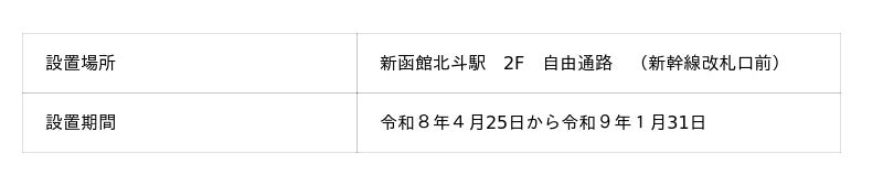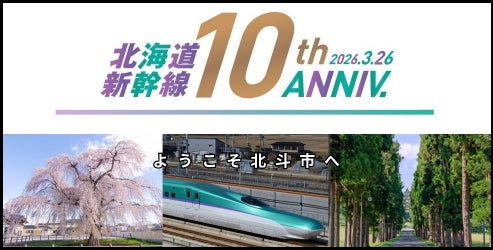北海道新幹線の玄関口、新函館北斗駅構内にて、北斗市誕生20周年と北海道新幹線開業10周年を祝う特別な懸垂幕で、地域の魅力を広くPRいたします。