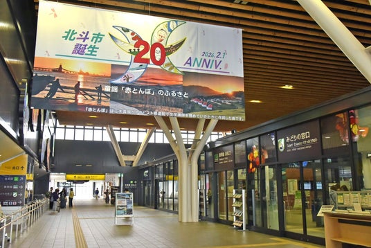 令和8年2月1日、北斗市は誕生20周年を迎え、さらに令和8年3月26日には北海道新幹線の開業10周年を迎えます。これを記念して、懸垂幕を新函館北斗駅構内に設置しました。