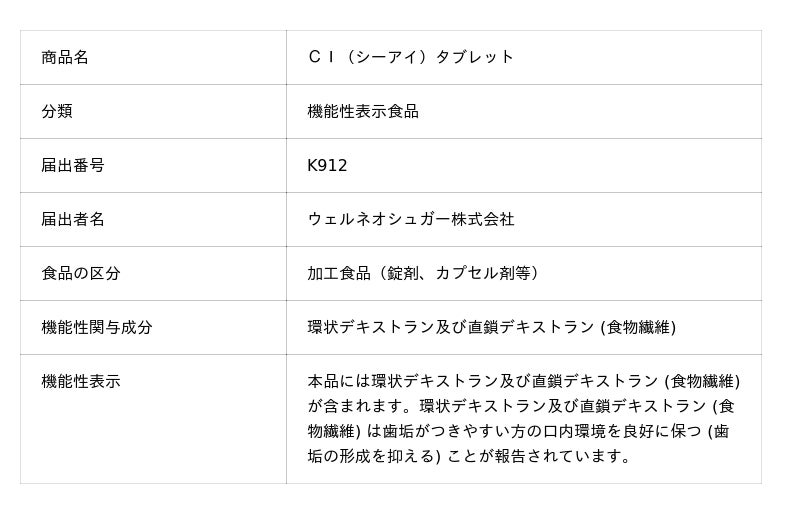 ウェルネオシュガー株式会社(本社:東京都中央区、代表取締役社長:山本 貢司)は、当社が製造・販売するオーラルケア向け素材「CI-Dextran mix」を配合した「CI(シーアイ)タブレット」について機能性表示食品の届出を行い、2026年4月22日付で受理されましたことをお知らせいたします。